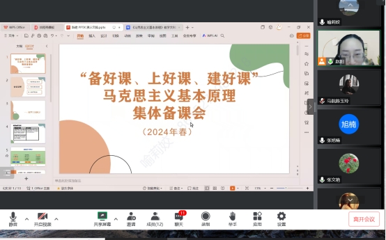 通讯员 喻莉姣)甲辰龙年襄阳春雪纷飞,白雪落处皆美景。新学期伊始,这场春雪为大家送上了龙年视觉盛宴,也为大家的集体备课增添了些许挑战。由于几天的飞雪与冰冻,路面结冰,市民出行不便,马克思主义基本原理教研室适时适事采取了线上备课的方式,借助“腾讯会议”举行了以“备好课、上好课、建好课”为主题的集体备课会。马克思主义基本原理(以下简称“原理”)教研室于2024年2月22日开展新学期第一次集体备课会。备课会由“原理”教研室主任赵阳主持,本学期“原理”课全体任课教师共同参加会议。