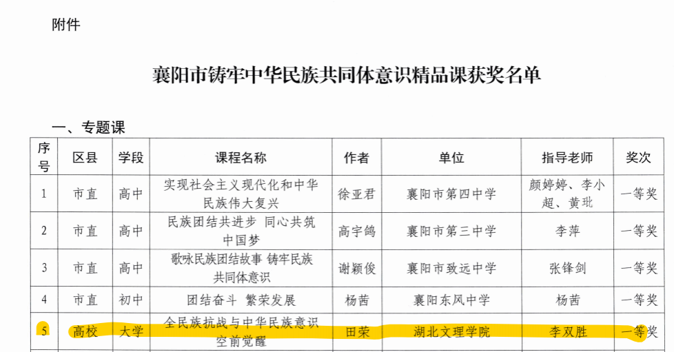 近日,襄阳市铸牢中华民族共同体意识精品课评选结果对外公布,由 a片 副院长李双胜指导, a片 教师田荣讲授的《全民族抗战与中华民族意识空前觉醒》获得襄阳市铸牢中华民族共同体意识精品课“专题课”组一等奖。