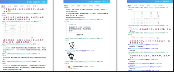 线上教学第一周,为了方便教学工作的开展,也为了帮助学生更快适应并进入学习的正常轨道,第一时间加入班级官方群,了解所有班级学生基本信息,特别是确保每一位学生加入本课程的线上学习平台,同时上传《原理》课程学生线上学习手册,并以线上语音辅导的形式针对线上学习总体要求以及学生遇到的问题作具体讲解。在发布第一周教学内容与安排的同时,创建2020《原理》班级学委群,通过各班级学委适时向所在班级发布通知并反馈学习问题。随后,为避免信息扎堆造成学生目不暇接,根据实际需要,在教学第二周立即创建六个独立的《原理》班级教学群。每周的教学计划与安排都是通过各个班级群平台准时发布,其中包括教学内容与系统开放时间,教学任务点的分布与介绍、线上辅导内容与时间公告等。
