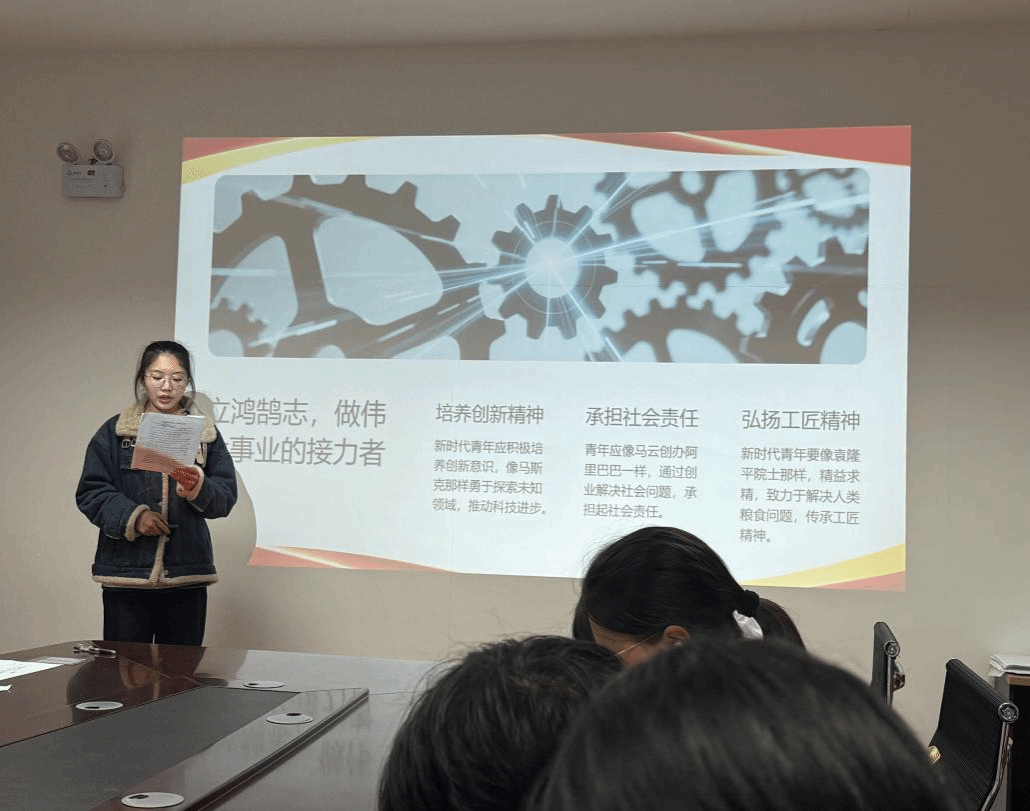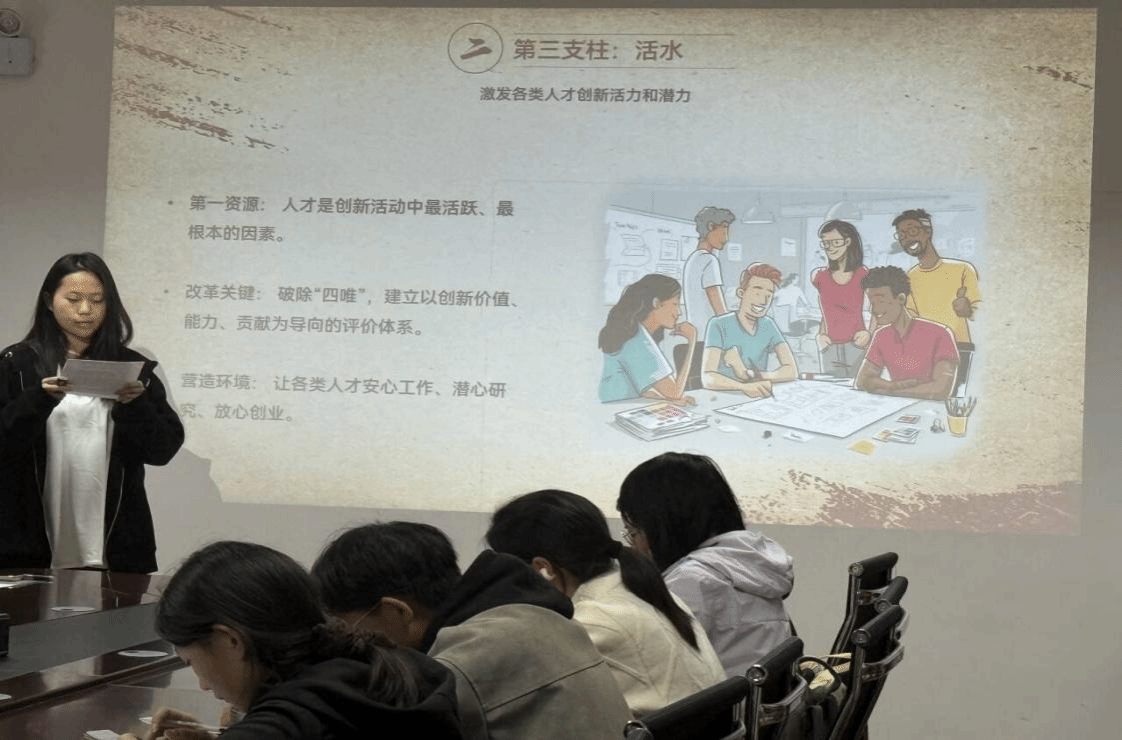 九位学生主讲人围绕《习近平谈治国理政》第五卷专题五“一体推进教育科技人才事业发展”的研读心得进行展示汇报。