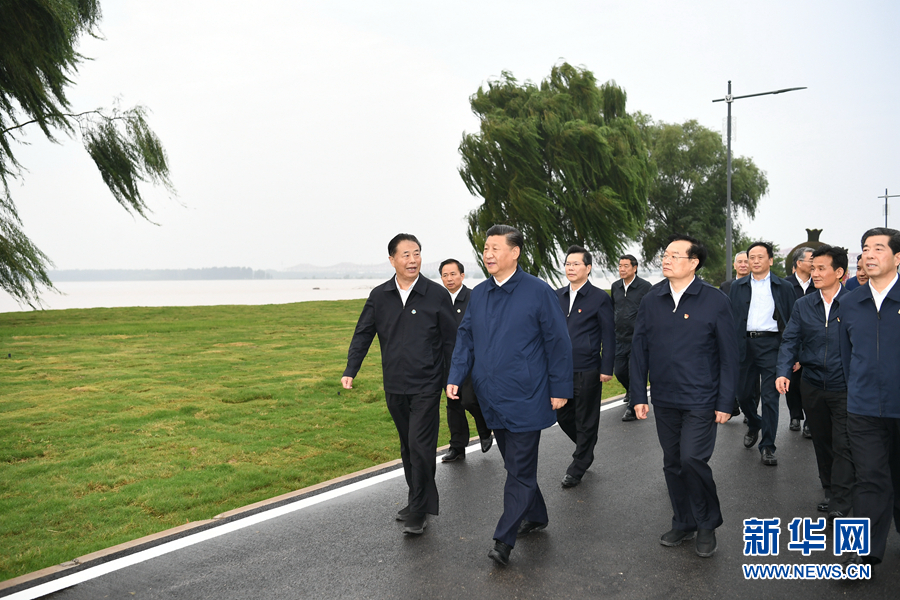 9月18日上午,中共中央总书记、国家主席、中央军委主席习近平在郑州主持召开黄河流域生态保护和高质量发展座谈会并发表重要讲话。这是座谈会前,习近平于17日下午在郑州黄河国家地质公园,沿黄河岸边步行察看周边环境,了解沿黄地区生态保护、水资源利用、堤防建设和防洪形势等情况。 新华社记者 谢环驰 摄