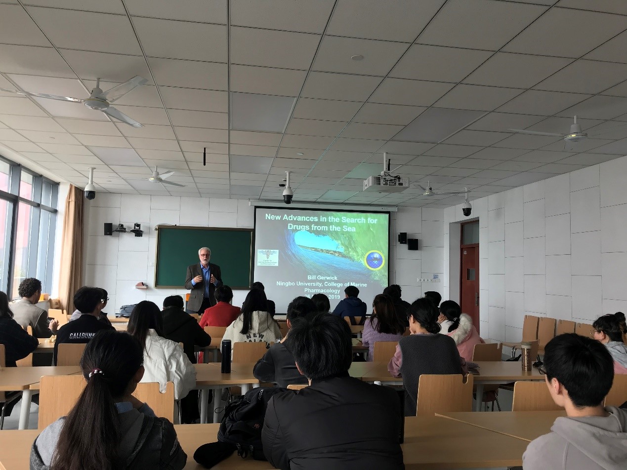 圣迭戈分校(University of California, San Diego,简称为UCSD)在海洋药物领域的发现,以Salinosporamide A和Plinabulin为例进行介绍,这两个海洋微生物的产物已经进入了临床研究,用于治疗多发性骨髓瘤和实体瘤。随着海洋天然产物开发的积累,发现结构新颖的新化合物的概率比以前降低,Gerwick教授强调开发新的研究方法的重要性。新的研究方法,如生物信息学工具的运用、生物合成基因组的异源表达或本源表达和比较代谢组学分析等,对高效发现结构新颖的海洋天然产物有重要作用。Gerwick教授以自己课程组的Camamycins系列化合物、Carmaphycin系列化合物和Columbamide化合物为例介绍这些新方法在开发海洋天然产物方面的应用。此次学术报告,内容充实、条理清楚、以实例介绍新技术新方法在海洋天然产物领域的应用,开拓师生的眼界!