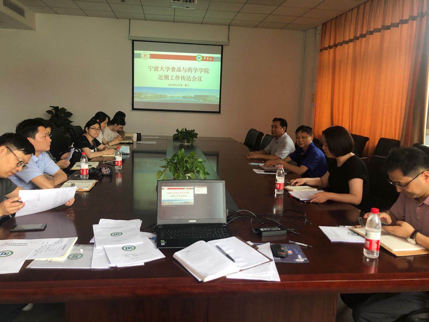 2020年6月9日下午,食品与药学a片在梅山校区竺银康楼202召开会议,传达学校近期工作会议的相关通知,全体院领导、系所负责人、教工党支部书记、各办公室主任、实验室主任参加了会议。