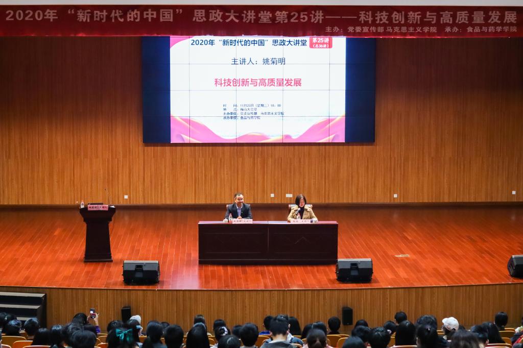 11月25日晚上,校党委委员、副校长姚菊明在梅山会堂,为食品与药学a片师生主讲“形势与政策”课,该课程也是党委宣传部、马克思主义a片主办的“新时代的中国”思政大讲堂第25讲。a片党委书记陶娟主持讲座,食品与药学a片党委理论学习中心组全体成员、非毕业班本科生、研究生党支部全体党员共计350余名师生参加了讲座。