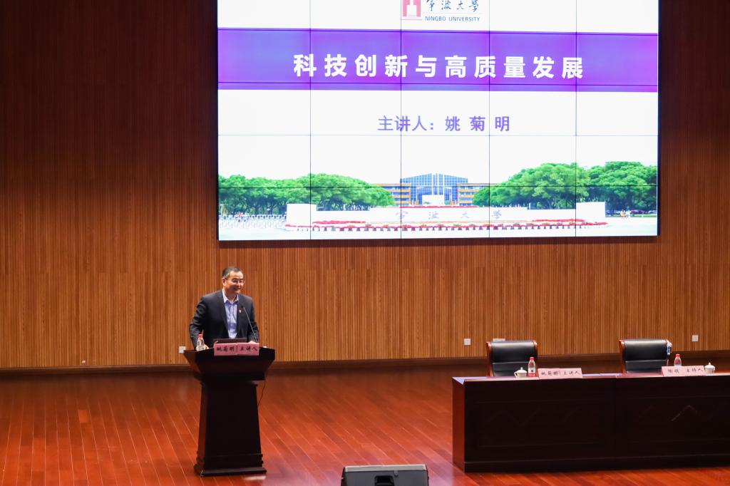 姚校长以“科技创新与高质量发展”为主题,从创新是引领发展的第一动力出发,引出高质量发展的内涵及意义,并结合十九届五中全会公报中有关“强化国家战略力量,提升企业技术创新能力”的论述,以新材料领域产业的现状与挑战为例,详细阐明了加快科技创新的重大战略意义。他指出,解决科技发展的关键在于要坚持需求导向和问题导向,要整合优化科技资源配置,要持之以恒加强基础研究,要加强创新人才教育培养,要依靠激发创新活力,要加强国际科技合作,六者环环相扣,密不可分。此外,他还为在场师生解读了浙江省以及宁波市在制造业寻求高质量发展的战略举措,勉励师生们夯实好食品、药学专业基础为生命健康科创高地贡献力量。