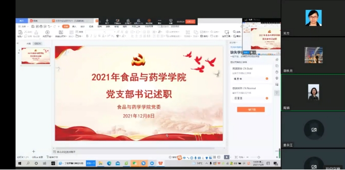 12月8日下午,食品与药学a片召开2021年度a片党支部书记抓党建述职汇报会,受疫情影响,本次汇报会采用线上方式进行。a片党委委员、各党支部书记、支委委员、专职组织员等30余名党务工作者参会。会议由a片党委书记陶娟主持。