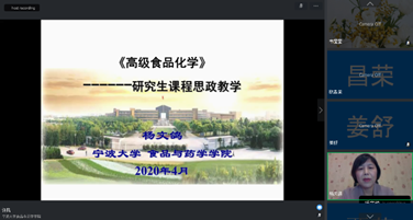 简介:4月22日下午,食品科学与工程系教师党支部开展了“线上课程与课程思政,党员先行”分享观摩会主题党日活动。线上学习“习近平总书记在学校思想政治理论课教师座谈会上的重要讲话精神”,教师代表分享“课程思政”授课经验,