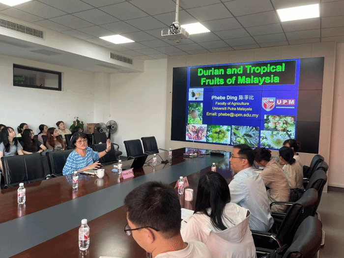 在报告中,Phebe教授重点介绍了马来西亚榴莲的主要产区、品种、采收方式、贮运保鲜和加工形式,并与泰国榴莲采后商业技术模式进行了对比。详细讲解了液氮超低温冻结技术在马来西亚出口榴莲中的商业化应用。Phebe教授用风趣幽默的语言和严谨的科学研究,让师生们对榴莲采收与贮运加工有了更深入的了解。报告结束后,Phebe教授还就我院承担的2024年度宁波市“科创甬江2035”关键技术突破计划——东南亚主要进口水果品质保障关键技术研究与应用,展开详细的研讨和交流。