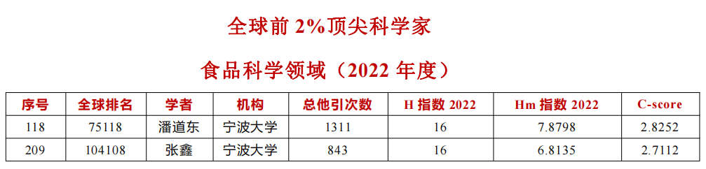 发布了2023年“全球前2%顶尖科学家”(World's Top 2% Scientists 2023)榜单。该榜单基于Scopus数据库的引用数据系统分析,以被引数(区分自引和他引,提供自引数据)、H-index、Hm-index、单独作者、单独或者第一作者以及单独、第一或者最后作者的文章引用量六个方面进行综合评价 (composite score,C-score),根据生涯影响力和年度影响力,从近700万名科学家中遴选出世界排名前2%的科学家。该榜单为科学家长期科研表现提供了一个衡量指标,能够更客观、更真实地反映科学家的影响力。其中,我院潘道东教授,张鑫副教授上榜。