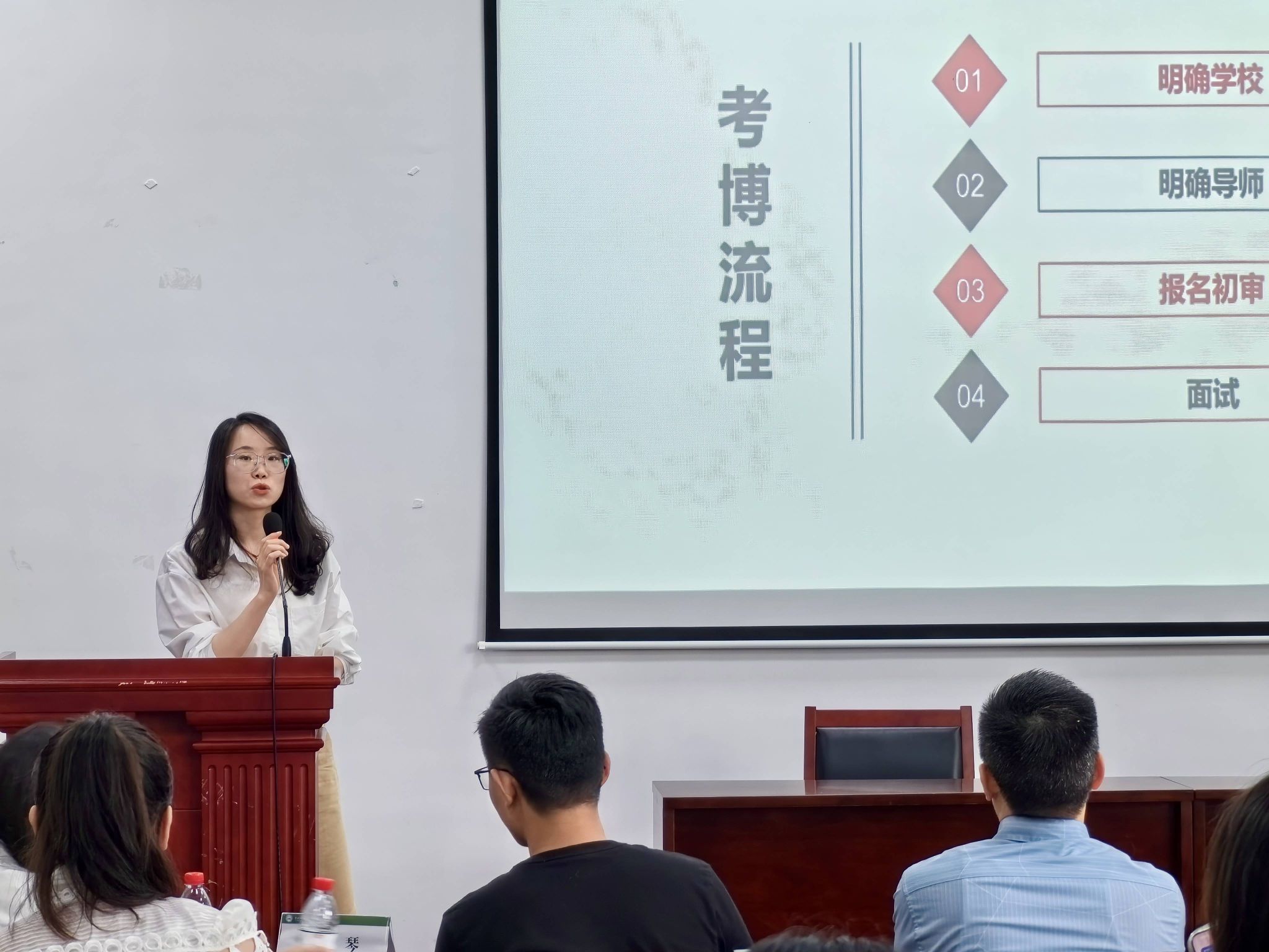 交流会伊始,阮怡清老师简要介绍了到场的嘉宾,并代表a片致以热烈的欢迎。随后,陈琴、韩传虎、山圣洲、赵子畅、李佳美五位已经考取博士的同学依次上台,结合个人考博经历,分享了宝贵的备考经验和备考建议。他们分别从申博流程、考试内容、面试技巧、学校和导师的选择等多个方面进行了深入剖析,为正处于未来道路抉择的同学们点亮了一盏明灯。