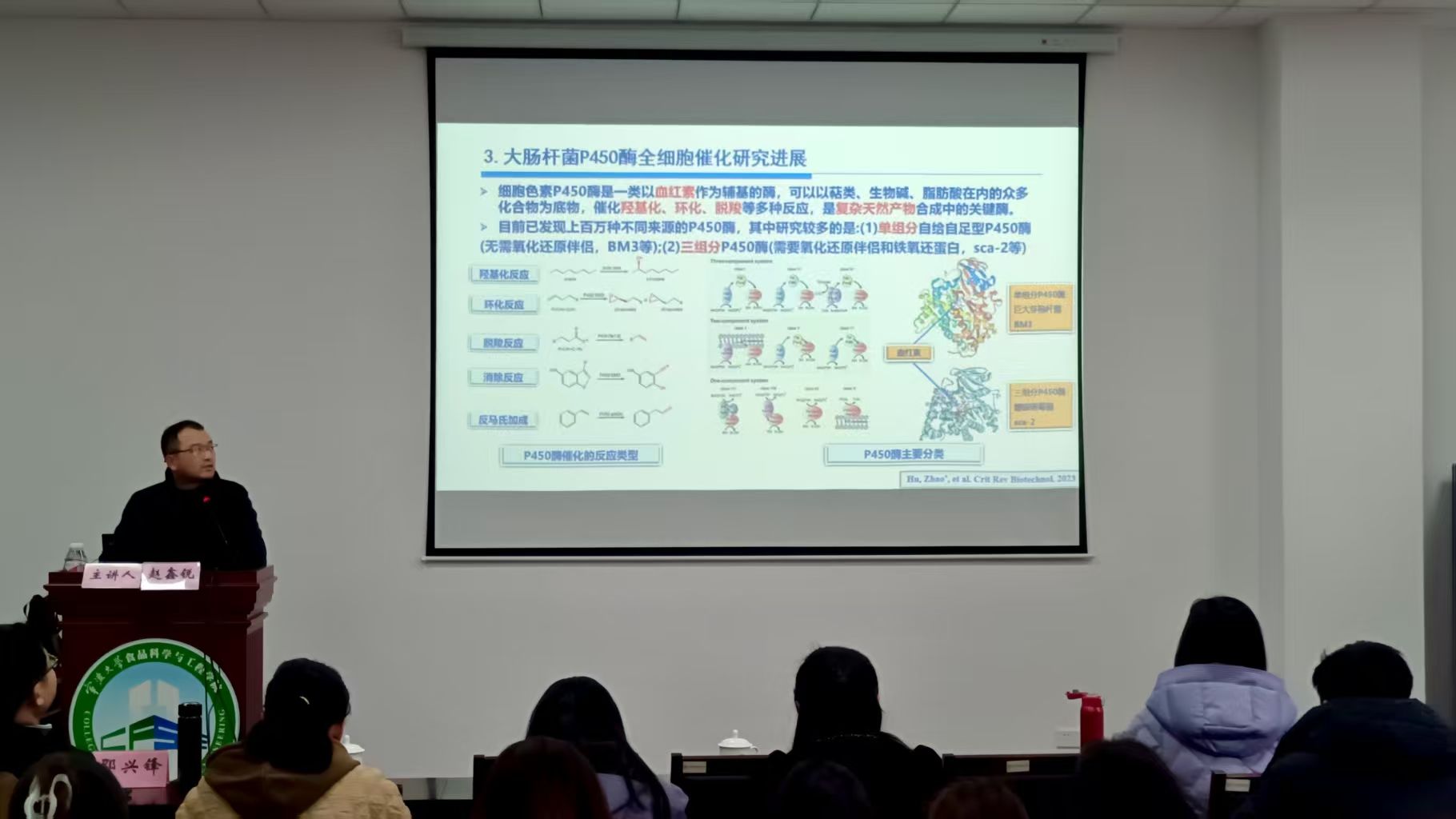 赵鑫锐研究员从血红素合成研究进展、大肠杆菌P450酶全细胞催化研究进展、毕赤酵母血红素结合蛋白高效合成研究进展三个方面作了全面介绍。首先,赵老师简要介绍了血红素合成途径及前期研究;接着详细讲解了关于大肠杆菌P450酶全细胞催化在天然产物、药物合成中的应用、面临问题及相应改造策略;然后讲授了毕赤酵母血红素结合蛋白高效合成机制。讲座结束后,师生们积极提问发言,与赵老师进行了交流和讨论。