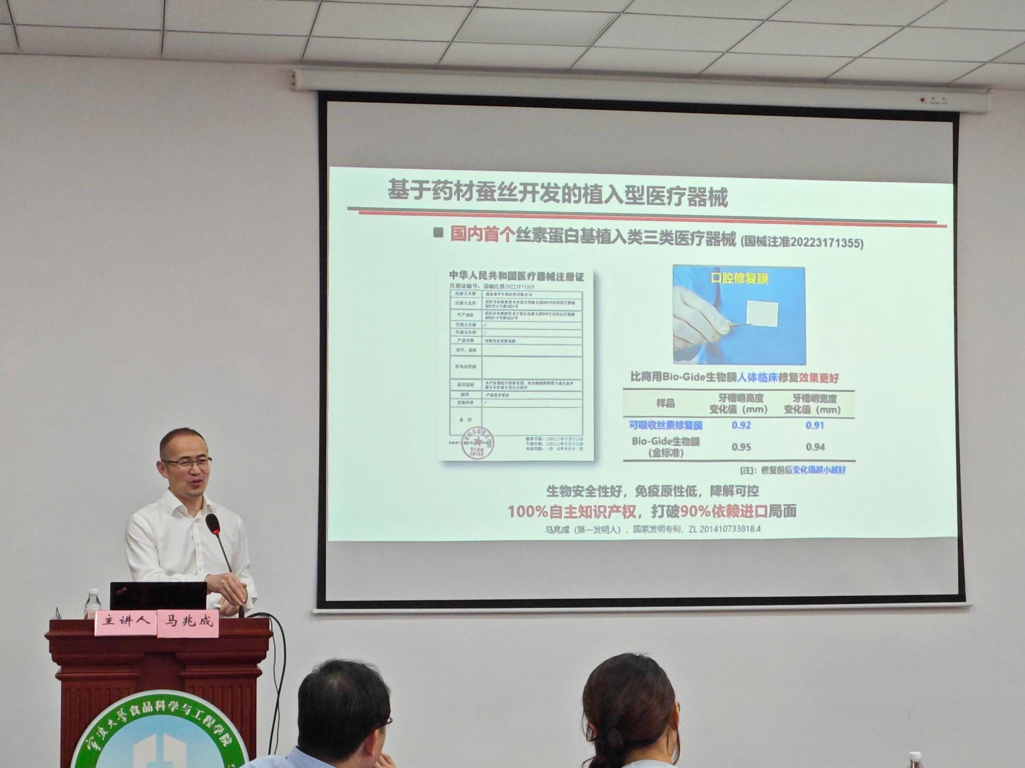首先,马兆成教授系统阐述了药食同源理念的科学内涵及其在现代健康产业中的实践意义。他结合国内外新资源食品原料的研究进展,详细介绍了菊粉、苦蓟草、金线莲等天然成分在调节肠道菌群、改善非酒精性脂肪性肝炎(NASH)及保护肝脏健康方面的显著功效。马教授特别强调了陈皮类果实原料的抗炎作用,并分享了团队在关键抗炎化合物鉴定方面的突破性成果。此外,他还介绍了柠檬疗法在高效安全降尿酸中的应用,以及团队研发的国内首个丝素蛋白基植入类三类医疗器械,该器械以其优异的生物安全性和可控降解性展现了广阔的应用前景。