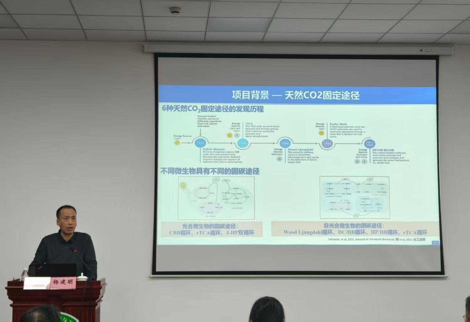 杨建明教授在报告中指出,合成生物学技术作为21世纪优先发展的六大颠覆性技术之一,正在引领“第三轮生物学革命”,有望深刻变革医药、食品、能源、材料、军事及农产品等多个领域的发展模式。他重点介绍了微生物固碳的机制,并以沼泽红假单胞菌为例,阐述了其四种营养模式及其在农业、环境修复、生物能源等方面的广泛应用。此外,杨教授还分享了合成生物学在生物探测领域的前沿研究,特别是在地雷与爆炸物探测方面的技术突破,推动了生物传感技术在多元场景中的创新应用。