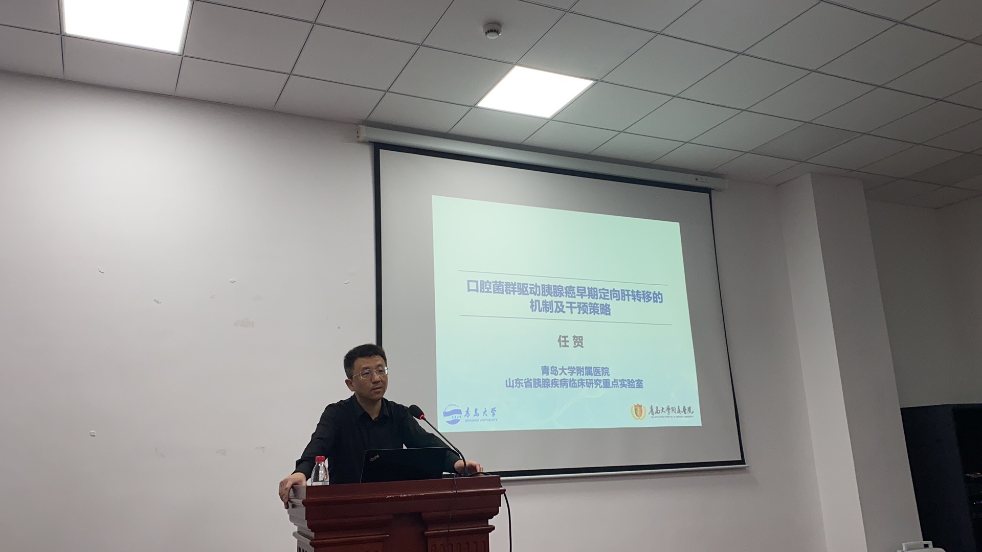 医学部副部长任贺教授在梅山校区竺银康楼120会议室为我院师生做题为《口腔菌群驱动胰腺癌早期定向肝转移的机制及干预策略》的学术报告。参与报告会的主要为食药a片教师和研究生,执行院长邵兴锋主持了报告会。