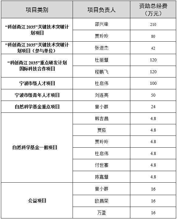 2024年,我院获批宁波市“科创甬江2035”关键技术突破计划项目2项,参与1项;获批宁波市“科创甬江2035”重点研发计划国际科技合作项目2项;获批宁波市级人才项目1项;获批宁波市级青年人才项目1项;获批宁波市自然基金重点项目1项、一般项目6项;获批宁波市公益项目3项。总经费预计达822.8万元。