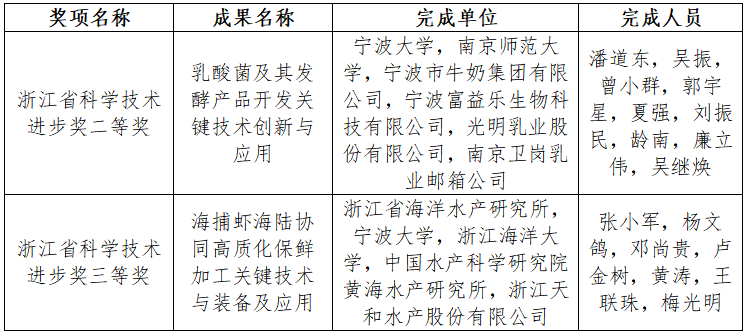 2024年11月22日上午,加快建设创新浙江因地制宜发展新质生产力动员部署会暨全省科学技术奖励大会在杭州举行。大会表彰了2023年度浙江省科学技术奖,其中我院潘道东教授主持完成的“乳酸菌及其发酵产品开发关键技术创新与应用”荣获浙江省科学技术进步奖二等奖,杨文鸽教授(第二单位)参与的“海捕虾海陆协同高质化保鲜加工关键技术与装备及应用”荣获浙江省科学技术进步奖三等奖。